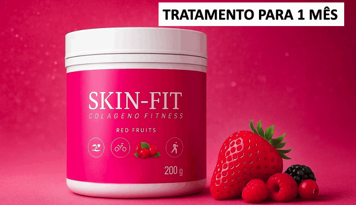 SKIN-FIT Colágeno Fitness é um suplemento em pó solúvel com cafeína e taurina que auxilia na firmeza da pele e no desempenho físico.