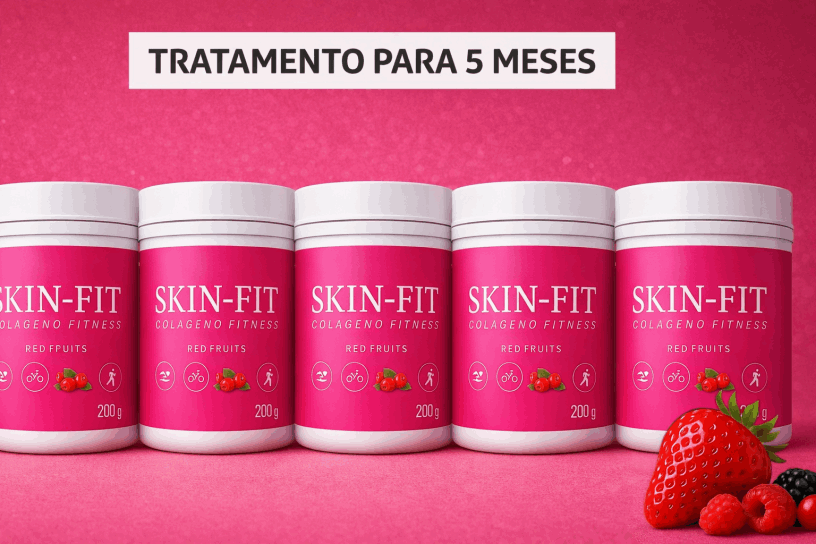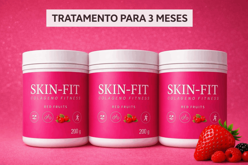 SKIN-FIT Colágeno Fitness é um suplemento em pó solúvel com cafeína e taurina que auxilia na firmeza da pele e no desempenho físico.